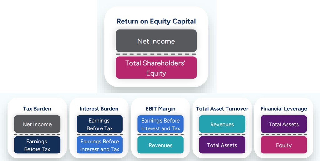 ROE = (Net Profit / EBT) × (EBT / EBIT) × (EBIT / Sales) × (Sales / Assets) × (Assets / Equity)